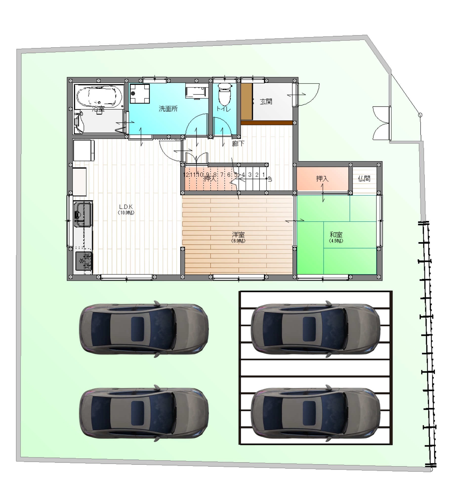 現在リノベーション中の住宅はカースペースが4台分あります。広々とした延床面積87.2㎡の居室空間、更にのびのび入浴できる広さ1坪以上の浴室はゆったり足を伸ばして充実のリラックスタイムを作ります。